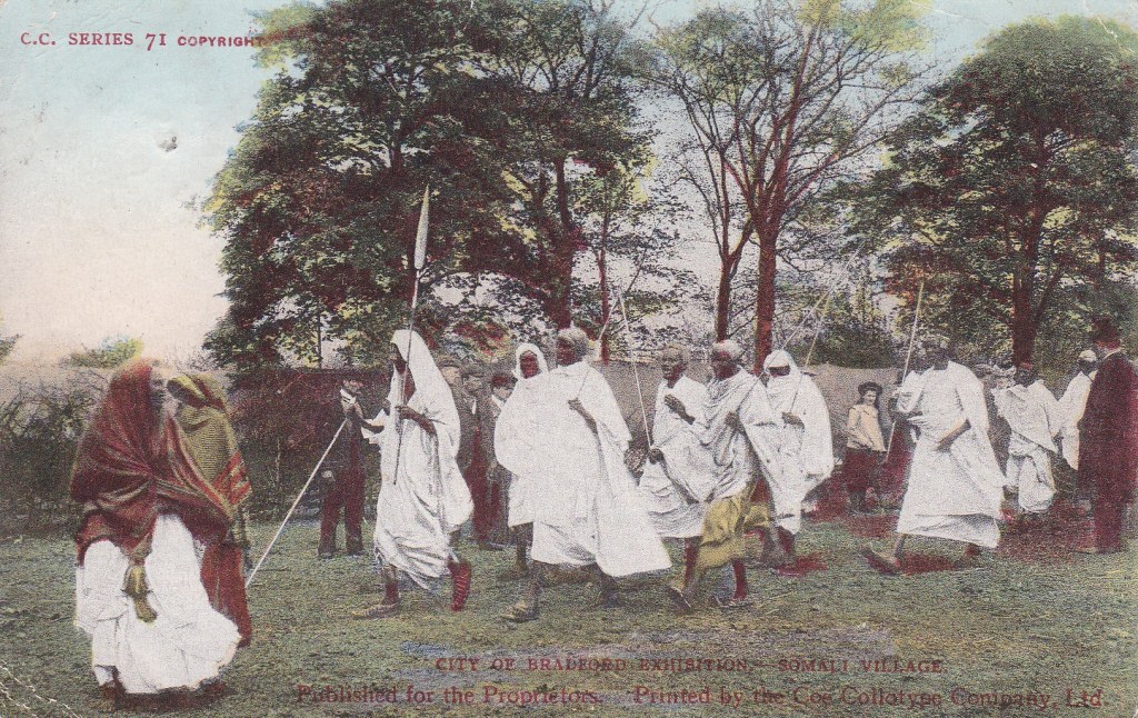 The Sultan Ali troupe that came to Bradford for the 1904 Great Exhibition was the second Somali ethnographic group in Britain after the Hersi Egeh Gorseh troupe that appeared at Crystal Palace in 1895 (see Bodhari Warsame’s article on Somali Troupes in Europe). Unlike the first troupe, which is the best documented, this project seeks to address the relative lack of knowledge about this second troupe visiting the British Isles. The Sultan Ali troupe may have originated from the Djibouti-Abyssinian/Ethiopian border, but this hypothesis has to be solidified, as the European press reports make different claims – the Yorkshire and French press in 1904 said it came from Somaliland, while the German newspapers in 1905‒6 said it came from Djibouti.